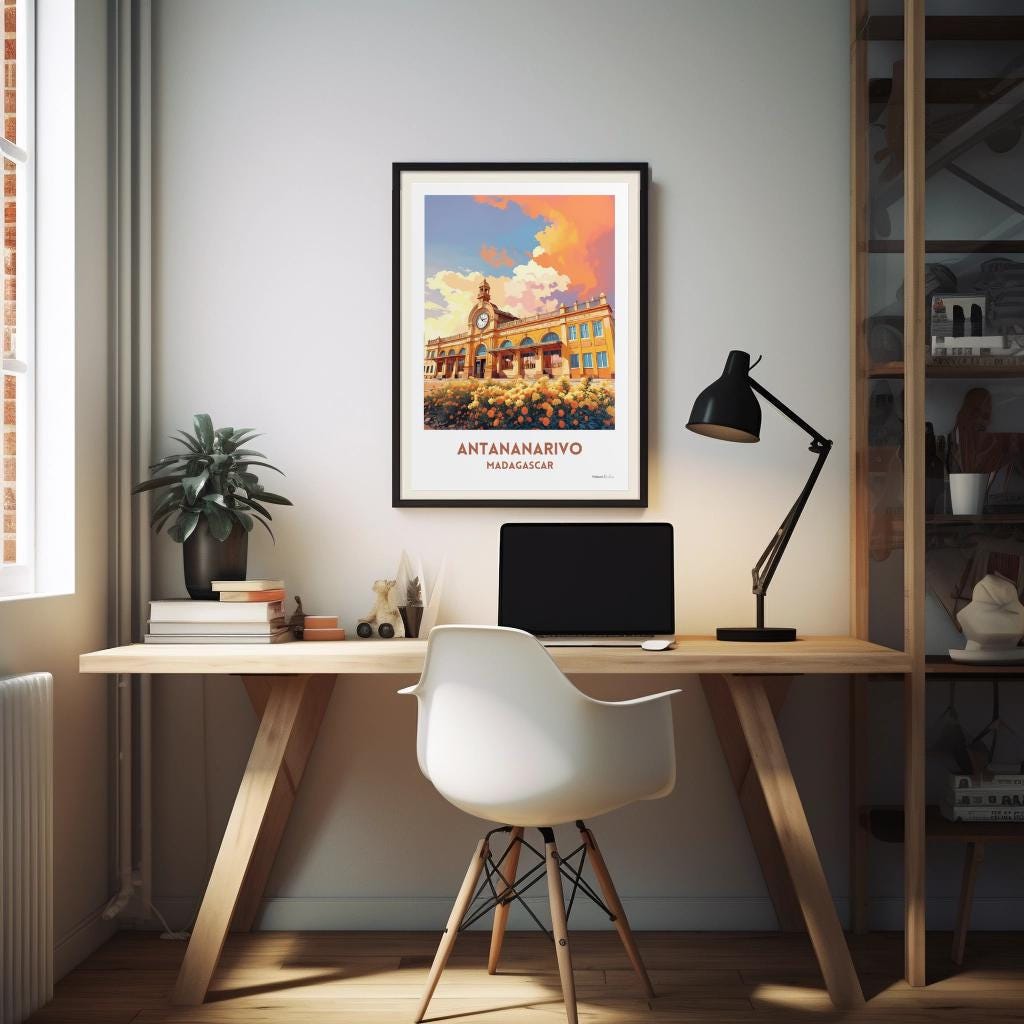 🇫🇷 Construite au début du 20e siècle, la Gare de Soaranoa joué un rôle essentiel en reliant la capitale aux autres grandes villes de l'île, facilitant le transport de marchandises et de personnes et contribuant au développement économique du pays. Son architecture coloniale française, avec ses lignes élégantes et son grand hall ouvert, est un exemple remarquable du style de l'époque. Cette affiche de voyage capture l'essence du passé vibrant de Madagascar, ajoutant une touche d'aventure et de charme historique à votre décoration tout en célébrant le riche patrimoine culturel de l'île. Une idée cadeau parfaite pour les passionnés de Madagascar !